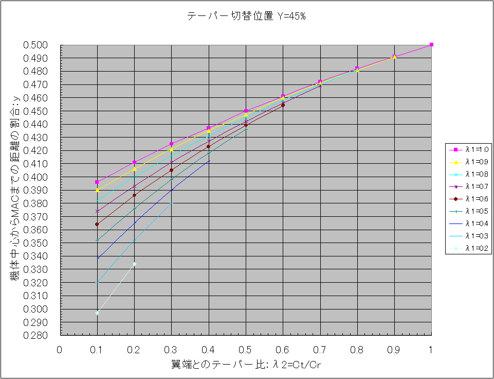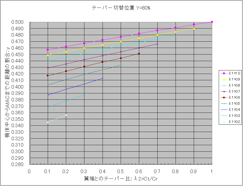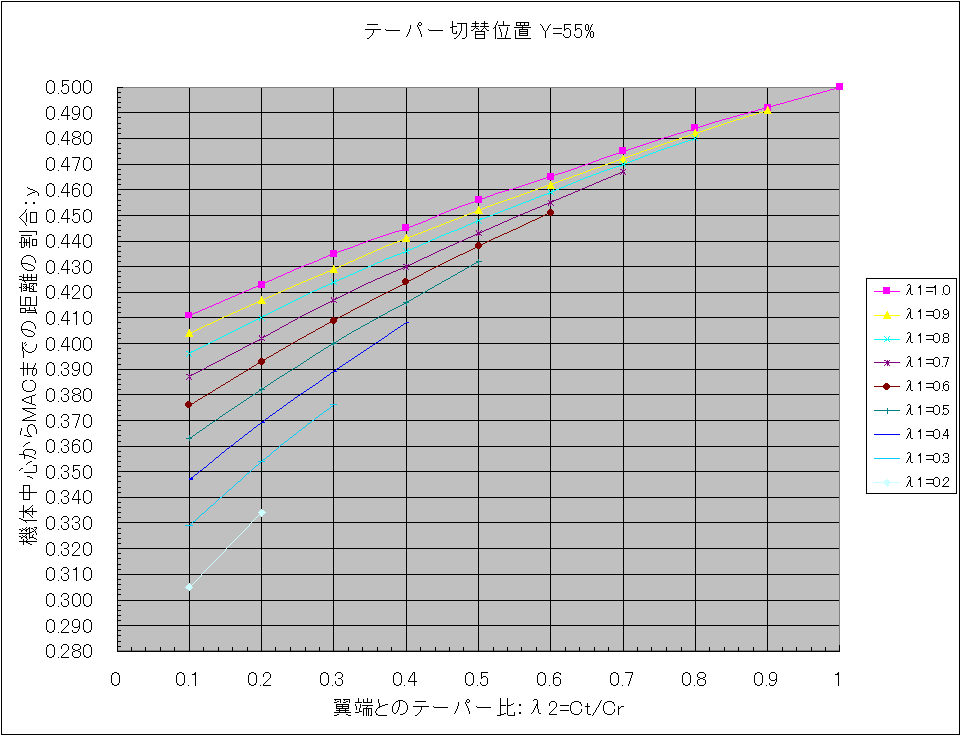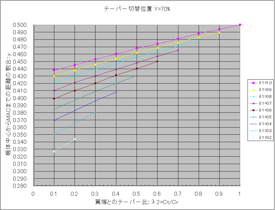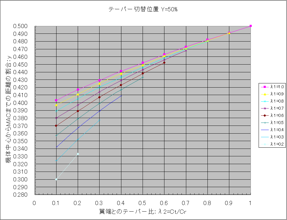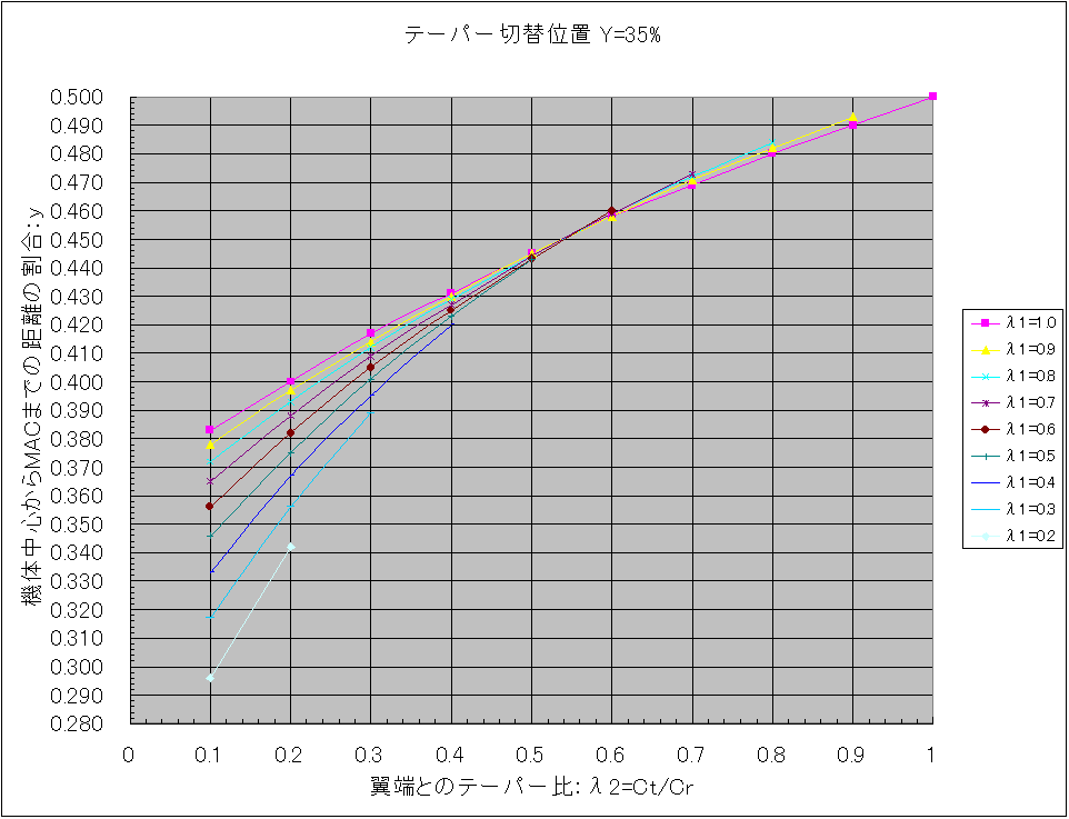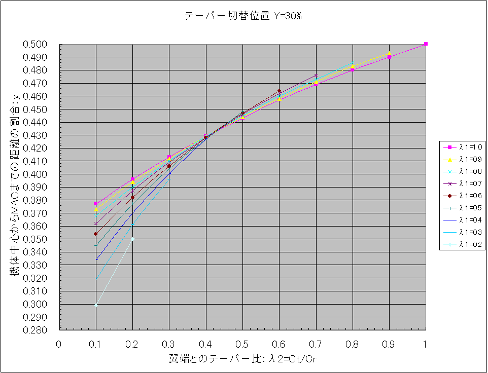 下図を参考に各テーパー比、λ1、λ2を機体から実測して、自機のテーパー切替位置にあったグラフを使用します。 λ1、λ2の組み合わせでMAC位置の値を読み取り、片翼幅の寸法を掛ければ機体中心位置からの距離が求まります。 具体的な使い方は「Ka-8bのMAC位置をグラフから読み取る」を見てください。 また2段テーパーではなく、単純なテーパー翼の場合は「重心位置と平均空力翼弦」にある表で求めます。 テーパー切替位置=30% テーパー切替位置=35% テーパー切替位置=40% テーパー切替位置=45% テーパー切替位置=50% テーパー切替位置=55% テーパー切替位置=60% テーパー切替位置=65% テーパー切替位置=70% テーパー切替位置=75% テーパー切替位置=80% 尚、このグラフを作成するにあたっての根拠は「2段テーパー翼の平均空力翼弦位置(2)」です。 PR コメントを投稿する
